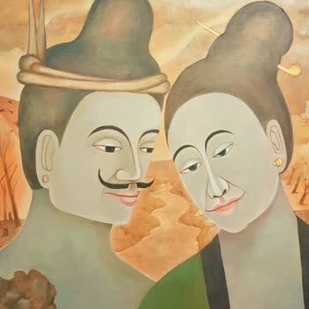| คำอธิบาย : ปูม่านย่าม่าน หรือภาพ "กระซิบรักบันลือโลก" ภาพต้นฉบับเป็นภาพจิตกรรมฝาผนังภายในวัดภูมินทร์ จังหวัดน่าน เป็นผลงานการสร้างสรรค์จาก "หนานบัวผัน" จิตกรเชื้อสายไทยลื้อ ผลงานภาพวาดปูม่านย่าม่านนี้ได้รับการยอมรับว่าเป็นผลงานที่ปราณีตและเป็นภาพจิตกรรมฝาผนังที่โดดเด่นประจำวัดภูมินทร์ ภาพของปู่ม่านย่าม่านที่เห็นนี้เป็นภาพของผู้หญิงและผู้ชายคู่หนึ่งที่กำลังกระซิบเพื่อสนทนากัน ปู่ม่าน ย่าม่าน เป็นภาพของหญิงชายพม่าที่เป็นสามีภรรยากัน โดยคำว่า "ม่าน" คือ "พม่า" คำว่า ปู่ เป็นคำเรียกของผู้ชายที่พ้นวัยเด็กมาแล้ว ย่า (คำเดิมคือคำว่า "ง่า") เป็นคำเรียกของผู้หญิงที่พ้นวัยเด็กมาแล้ว ภาพ "ปู่ม่านย่าม่าน" เป็นหนึ่งในภาพจิตกรรมฝาผนังที่วาดขึ้นเมื่อครั้งมีการบูรณะซ่อมแซมวัดภูมินทร์เมื่อปี พ.ศ.2410 - 2417 ปัจจุบันภาพปู่ม่านย่าม่านกลายเป็นสัญลักษณ์ของเมืองน่านที่ปรากฏอยู่บนผลิตภัณฑ์ต่างๆ เช่น ภาพวาดที่เป็นของแต่งบ้าน ไปรษณียบัตร เป็นต้น |