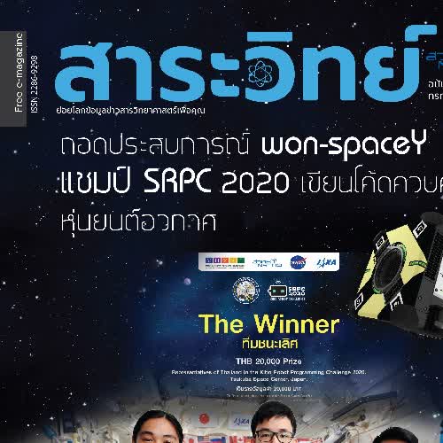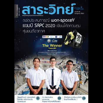 | คำอธิบาย : นิตยสารสาระวิทย์ โดย สวทช. ฉบับที่ 88 เดือนกรกฎาคม พ.ศ. 2563\สำหรับนิตยสารสาระวิทย์ ฉบับที่ 88 นี้ มีคอลัมน์ใหม่เพิ่มเติมอีก 2 คอลัมน์ คือ \"ร้อยพันวิทยา\" โดย อาจารย์รวิศ ทัศครอดีตกรรมการบริหาร และสมาชิกทีมบรรณาธิการ วารสารทางช้างเผือก สมาคมดาราศาสตร์ไทย เคยทำงานเป็นนักเขียนประจำนิตยสาร UpDATE นิตยสารวิทยาศาสตร์และเทคโนโลยี ของบริษัท ซีเอ็ดยูเคชั่น (มหาชน) จำกัด ปัจจุบันรับราชการเป็นอาจารย์ประจำสาขาวิชาวิทยาศาสตร์ และเทคโนโลยีการอาหาร คณะอุตสาหกรรมเกษตร มหาวิทยาลัยเชียงใหม่\และ \"สภากาแฟ\" โดย ผศ. ดร. ป๋วย อุ่นใจนักวิจัยชีวฟิสิกส์ และอาจารย์ประจำภาควิชาชีววิทยา คณะวิทยาศาสตร์ มหาวิทยาลั ยมหิดล นักสื่อสารวิทยาศาสตร์ นักเขียน ศิลปินภาพสามมิติ และผู้ประดิษฐ์ ฟอนต์ไทย มีความสนใจทั้งในด้านวิทยาศาสตร์ เทคโนโลยี งานศิลปะและบทกวี แอดมินและผู้ร่วมก่อตั้ง เพจ FB: ToxicAnt เพราะทุกสิ่งล้วนเป็นพิษ\เรื่องจากปก:- ถอดประสบการณ์ won-spaceY แชมป์ SPRC 2020 เขียนโค้ดควบคุมหุ่นยนต์อวกาศ\คอลัมน์ร้อยพันวิทยา:- ไก สาหร่ายไทยแสนอร่อยที่คุณอาจไม่เคยได้ลิ้มลอง (ตอนที่ 1)\คอลัมน์สภากาแฟ:- ชีวิตอิสระจะกลับมาเมื่อไร ในยุคโพสต์โควิด?\คอลัมน์สาระวิทย์ในศิลป์:- ตอน “STARGAZING EXPEDITION” Day 3\ระเบียงข่าว วิทย์-เทคโนฯ ไทย:- ‘MagikTuch’ ปุ่มกดลิฟต์ไร้สัมผัส นวัตกรรมรับ ‘นิว นอร์มอล’\หน้าต่างข่าว วิทย์-เทคโนฯ โลก:- ค้นพบอนุภาค \"แอ็กซิออน\" ที่ทฤษฎีฟิสิกส์ทำนายไว้เมื่อ 43 ปีก่อน\ดาวน์โหลดนิตยสาร “สาระวิทย์” ฉบับที่ 88 ได้ฟรีที่https://oer.learn.in.th/\และฉบับย้อนหลังได้ทางเว็บไซต์https://www.nstda.or.th/sci2pub\นิตยสารอิเล็กทรอนิกส์ \"สาระวิทย์\"ผลิตโดย: ฝ่ายสร้างสรรค์สื่อและผลิตภัณฑ์ สก.FB Page: นิตยสารสาระวิทย์ติดต่อกองบรรณาธิการ: sarawit@nstda.or.th |