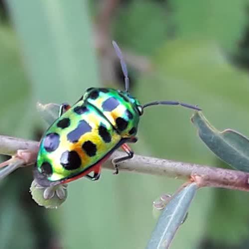 | คำอธิบาย : มวนตองแตก หรือ มวนลิ้นจี่ (ชื่อท้องถิ่น) ชื่อทางวิทยาศาสตร์เรียกว่า Chrysocoris stollii Wolff เป็นสัตว์ที่มีสีสันสวยงาม แต่ก็เป็นศัตรูตัวฉกาจของพืช เพราะเจ้ามวนตองแตกนี้จะ "ดูดกินน้ำเลี้ยงจากพืช" จนสร้างความเสียหายได้ |