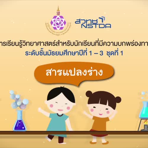 | คำสำคัญ : วีดิทัศน์เรื่องสารแปลงร่าง, กิจกรรมการเรียนรู้วิทยาศาสตร์สำหรับนักเรียนที่มีความบกพร่องทางการได้ยิน, การเกิดปฏิกิริยาเคมี, วิทย์หู, บทเรียนวิทยาศาสตร์สำหรับนักเรียนที่มีความบกพร่องทางการได้ยิน, การเกิดสารละลาย, วิทยาศาสตร์กายภาพ, สสารแปลงร่าง |