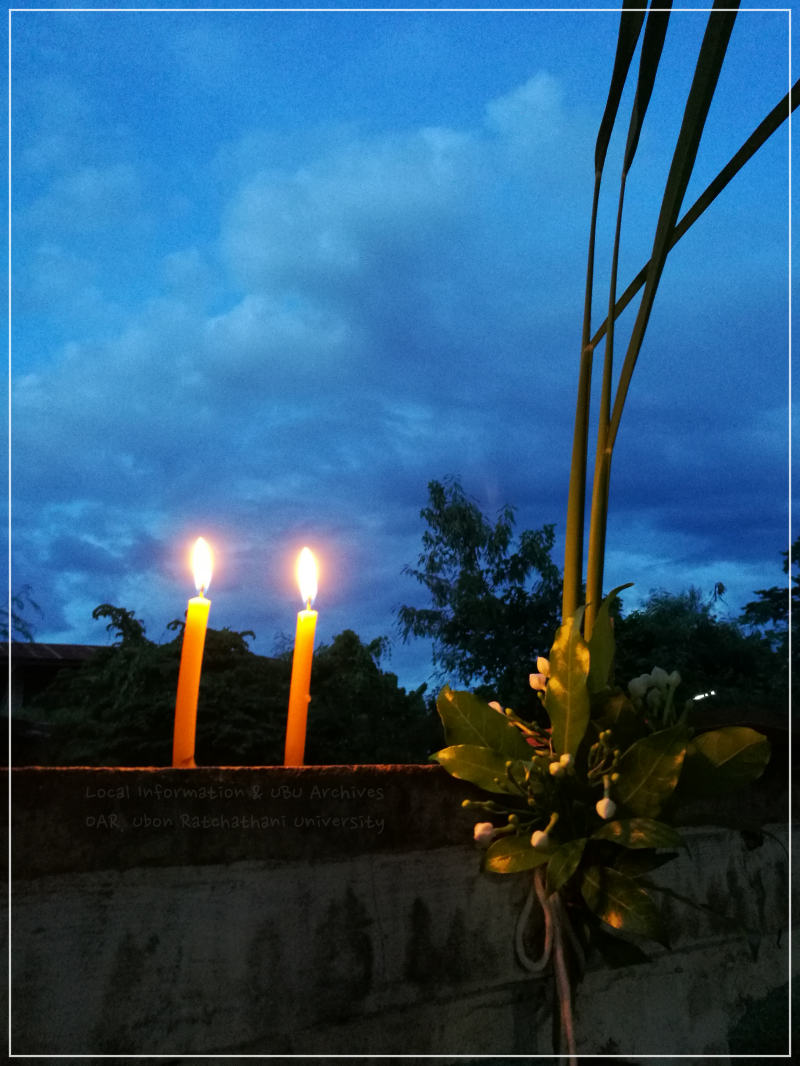 | คำอธิบาย : วันออกพรรษา ชาวบ้านอีสานบางพื้นที่ยังคงมีการจุดประทีปเทียนถวายดอกไม้ที่บ้านซึ่งจะทำกันในช่วงหัวค่ำเวลาประมาณ 18.00-20.00 น. โดยจะนำกาบกล้วยมาทำเป็นฐานคล้ายเรือ แล้วจุดเทียนปักลงบนเรือ พร้อมประดับตกแต่งด้วยดอกไม้ บางบ้านอาจจะมีการนำต้นข้าวที่กำลังตั้งท้อง (ข้าวมาน) มาตกแต่งบูชาด้วย ปัจจุบันอาจจะไม่ได้ทำเป็นเรือกล้วยแล้ว แต่จะมีการจุดเทียนไว้ตามราวรั้วหรือราวระเบียงแทน |