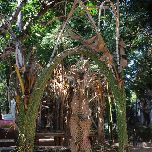 คำอธิบาย : หอประทีป มีลักษณะร้านหรือโรงเรือนสำหรับวางธูปเทียนขนาด 1×1 หรือ 2×2 เมตร มีเสาทั้งหมด 4, 8 หรือ 9 ต้น ทำด้วยต้นกล้วยที่ตัดใบออกให้เหลือสัก 4 ก้านเพื่อความสวยงามหรือไม่ตัดก็ได้ วางอยู่ที่มุมทั้งสี่ด้านและระหว่างต้นเสา ร้านหรือที่วางดอกไม้ทำมาจากไม้ไผ่ โดยนำมาสานขัดแตะและรองด้วยใบมะพร้าวติดเข้ากับเสาทั้ง 8 ต้นให้มีระดับความสูงประมาณ 1.5 เมตร ตัดต้นกล้วยมาวางเป็นแท่นสำหรับปักธูปเทียน และประดับตกแต่งโรงเรือนด้วยทางมะพร้าว ต้นอ้อย ธงทิว และดอกไม้ให้สวยงาม ใช้สำหรับวางธูปเทียน ดอกไม้ที่จุดถวายเป็นพุทธบูชาในงานบุญวันออกพรรษาของชาวอีสาน |