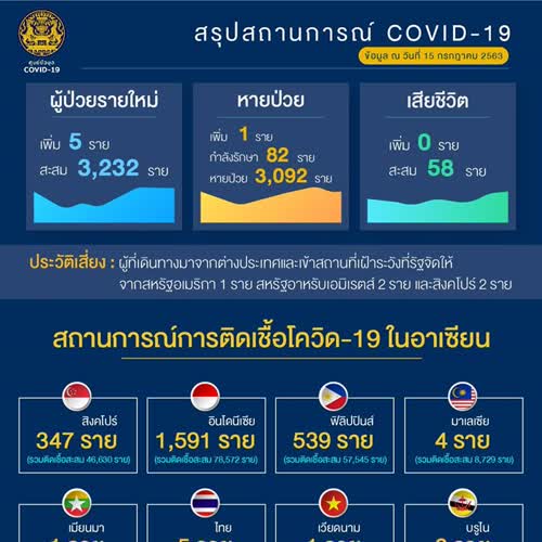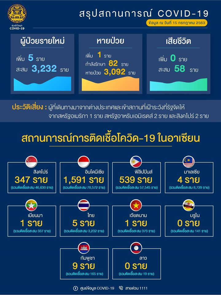 "สรุปสถานการณ์ COVID-19 ข้อมูล ณ วันที่ 15 กรกฎาคม 2563".