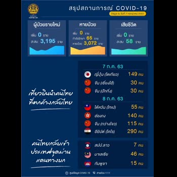 (2563). "สรุปสถานการณ์ COVID-19 ข้อมูล ณ วันที่ 7 กรกฎาคม 2563".