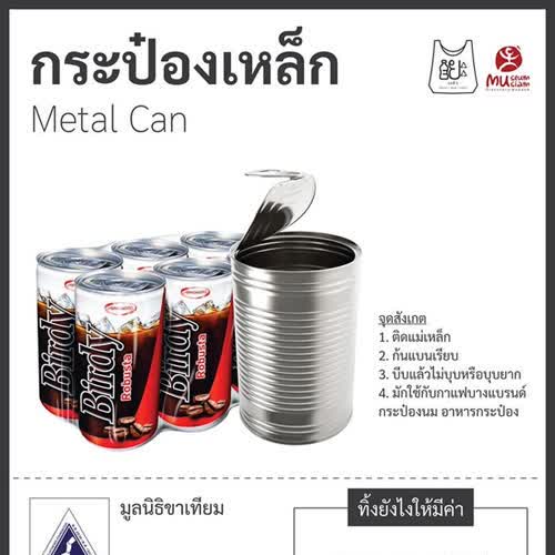 | คำอธิบาย : กระป๋องเครื่องดื่มที่ขายทั่วไปส่วนใหญ่เป็นกระป๋องอลูมิเนียมทั้งหมด รวมถึงส่วนที่เป็นห่วงเปิดฝากระป๋องที่เป็นอะลูมิเนียม ยังคงมีสินค้าบางยี่ห้อที่ใช้กระป๋องเหล็กบรรจุเครื่องดื่ม และจำเป็นต้องมีการจำแนกแยกประเภทให้ถูกต้อง เพราะอลูมิเนียมกับเหล็กไม่สามารถนำไปรีไซเคิลด้วยกันได้ |