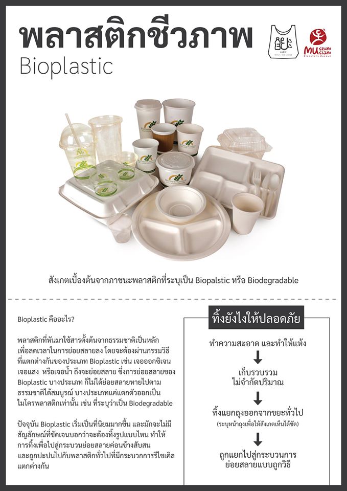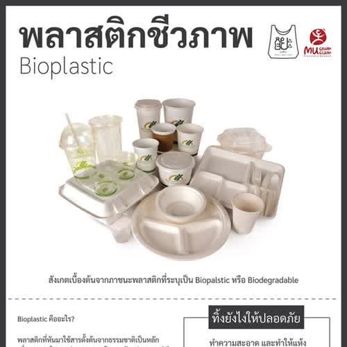 | คำอธิบาย : พลาสติกชีวภาพเป็นพลาสติกที่ผลิตจากวัตถุดิบทางการเกษตรหรือจากธรรมชาติที่สามารถย่อยสลายได้ตามกระบวนทางธรรมชาติ และใช้ระยะเวลาสั้นกว่าขยะที่เป็นพลาสติก แต่ก็ควรมีการจำแนกแยกประเภทออกจากพลาสติกทั่วไปเพื่อช่วยย่นระยะเวลาในการนำไปย่อยสลาย |
