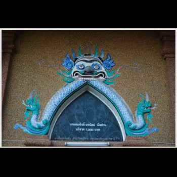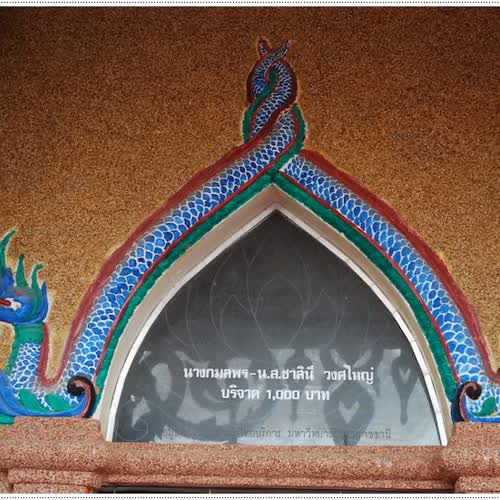 | คำอธิบาย : ลวดลายปูนปั้นวิหารพระนอนหรือวิหารพุทธไสยาสน์ วัดเหนือ อำเภอเขมราฐ จังหวัดอุบลราชธานี ซุ้มหน้าต่างเป็นรูปพญานาค 2 ตัวเอาหางพันกัน และที่ซุ้มประตูเป็นรูปราหูคาบหางพญานาค 2 ตัว เป็นฝีมือช่างญวน |