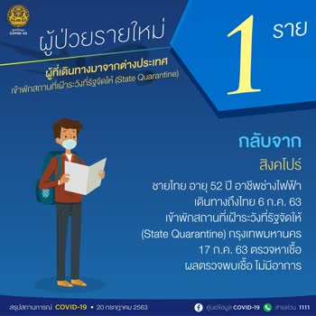 (2563). "สรุปสถานการณ์ COVID-19 วันที่ 20 กรกฎาคม 2563".