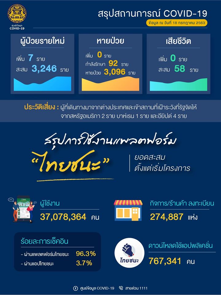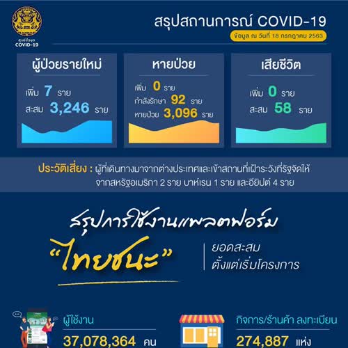 (2563). "สรุปสถานการณ์ COVID-19 ข้อมูล ณ วันที่ 18 กรกฎาคม 2563".