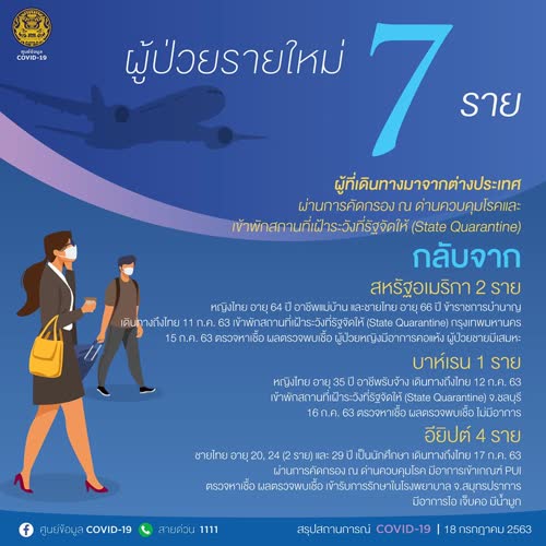 (2563). "สรุปสถานการณ์ COVID-19 วันที่ 18 กรกฎาคม 2563".