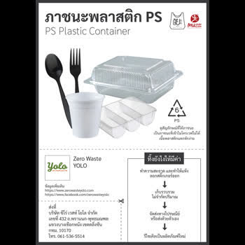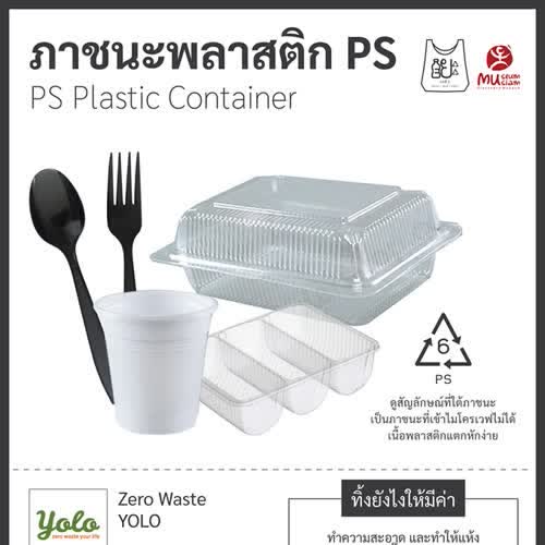 | คำอธิบาย : ภาชนะพลาสติก PS เป็นบรรจุภัณฑ์ที่นำมาใช้ทำกล่องใส่อาหาร ช้อน-ส้อมและแก้วน้ำ ซึ่งค่อนข้างมีความแข็งแรงมากกว่าภาชะพลาสติก PP และสามารถนำมารีไซเคิลได้หากมีการคัดแยกประเภทและทำความสะอาดก่อนการทิ้งขยะ |