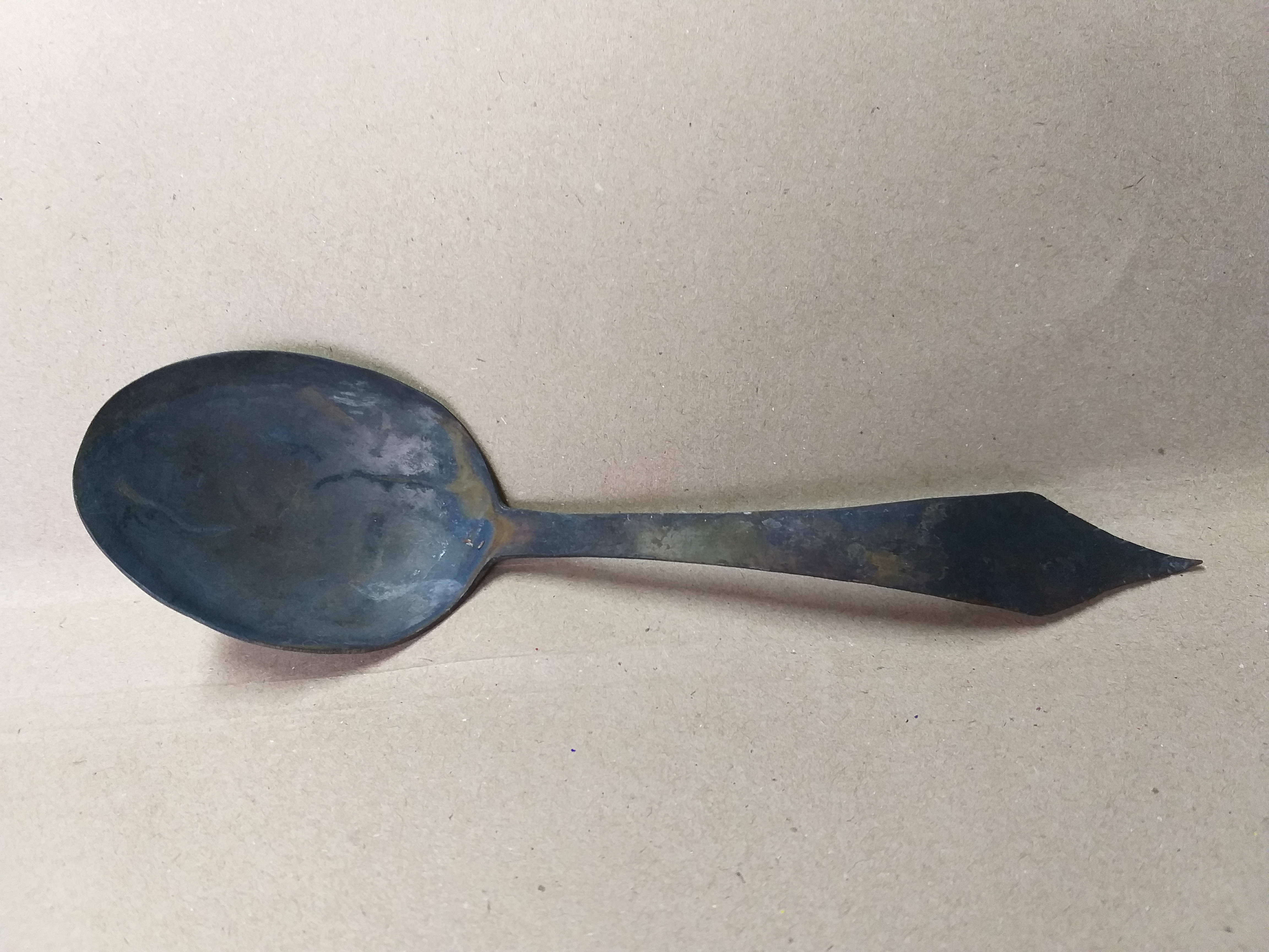 | คำอธิบาย : ช้อนทานอาหาร สำหรับตักแกง (อาหารที่เป็นน้ำ)ในสมัยรัชกาลที่ 5 ทำด้วยเนื้อทองเหลืองขันลงหิน ขนาดความยาว 7 นิ้ว |