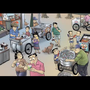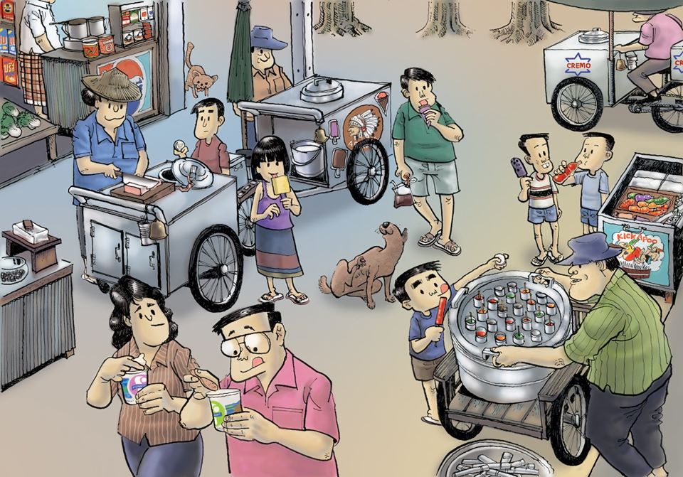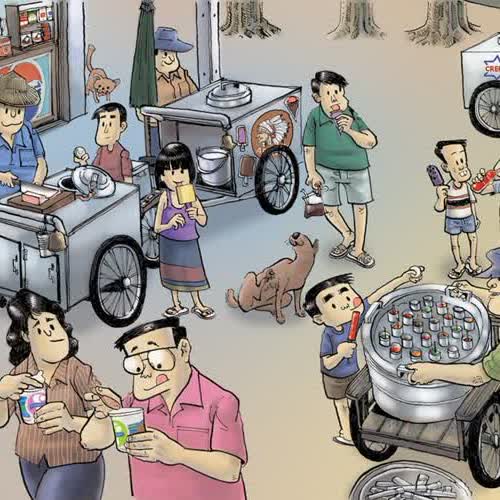 | คำอธิบาย : ทุกครั้งยามเข้าหน้าร้อน นอกจากการเล่นว่าว โดดน้ำเล่น เราก็ยังมีวิธีสู้แรงร้อนระอุของแดดด้วยของกิน\ของกินที่ว่านั่นก็คือเหล่า ‘#ไอติม’ หรือ ‘#ไอศกรีม’ หลากหลายประเภท ถ้าไม่นับรวม เหล่าน้ำหวานทั้งหลายที่ใส่ถุงแช่จนเย็นเป็นน้ำแข็ง ยามกินก็ใช้ปากเจาะก้นถุงดูดเอาๆ\#ไอติม ที่ถือว่าบ้านๆที่สุดและราคาถูกที่สุดในสมัยนั้น ก็จะเป็น #ไอติมหลอด ที่พ่อค้าจะใส่น้ำหวานสีและรสต่างๆในหลอดกระบอกโลหะ แล้วใส่ไปในช่องของถังโลหะที่ใส่น้ำแข็งโรยเกลือเอาไว้ จากนั้นก็จะจับเขย่าซ้ายขวาๆเสียงดังโกรกกราก พอเริ่มแข็งตัวก็เสียบไม้ลงไปเป็นด้ามจับ ไม่นานนักน้ำหวานที่ว่าก็จับตัวแข็งเป็นไอติมให้เราดูดกินชื่นใจจนปากซีดเลยทีเดียว\บางแห่งที่ทำมาสำเร็จแล้วใส่กระติกแขวนหัวไหล่มาเดินขาย มีวิธีเรียกลูกค้าด้วยโฆษณาว่าได้ไม้แดงสามารถเอามาแลกกินฟรีได้อีกด้วย\ถ้ามีทุนทรัพย์ขึ้นมาหน่อยจะเป็น #ไอติมตัด เป็นไอติมมีส่วนผสมของครีมอยู่บ้าง ทำเป็นก้อนสี่เหลี่ยมห่อพันด้วยกระดาษ เมื่อจะขายเค้าก็จะเอาขึ้นมาตัดให้ได้ขนาด แล้วเสียบไม้จับ ขนาดเล็ก 1 บาท ใหญ่ขึ้นมาก็ 2 บาทจะได้เยอะจนต้องเสียบไม้จับให้ถึง 2 อัน\ตามร้านชำจะมีไอติมแช่ไว้ในถังน้ำแข็งก้อน เป็นไอติมที่ทำจากน้ำหวานใส่ในหลอดพลาสติกแช่เย็นจนแข็งเป็นน้ำแข็ง รูปร่างของหลอดมักจะทำเป็นรูปขวดน้ำหวาน หรือฝักข้าวโพด มักขายกันอันละ 1 บาท เวลาจะกินก็ต้องใช้ฟันกัดจุกพลาสติกให้ขาด แล้วดูดน้ำหวานเย็นจัดข้างใน ซึ่งหลอดพลาสติกที่เหลือจากการกิน เด็กอย่างเรายังเอาไปใส่น้ำเล่นกันได้อีก\นอกจากนั้นก็มี #ไอติมแท่ง รสชาติต่างๆทั้ง ถั่วดำ ข้าวโพด ลอดช่อง และรสน้ำต่างๆเช่น กาแฟ น้ำแดง ซึ่งเดี๋ยวนี้มียี่ห้อดังๆไปขายในร้านสะดวกซื้อเสียด้วยซ้ำ\#ไอติม ที่ดูเป็น #ไอศกรีม จริงๆขึ้นมาหน่อยและมียี่ห้อด้วย ที่จำได้ก็ #ไอศกรีมอาปาเช่ ที่โลโก้จะเป็นรูปหัวอินเดียนแดง เป็น #ไอศกรีม ราคาถูกไล่ตั้งแต่ ไอศกรีมแบบแท่งราคา 1 บาท ไอศกรีมถ้วยก็ 2 บาท ไปจนถึง 3 บาท ก็จะเป็นไอศกรีมโคนแบบ คอนเน็ตโต สมัยนี้ แต่โคนของ อาปาเช่ มักจะเหลวเป๋วเหนียวหนึบมาตั้งแต่ในรถขาย\ถ้าไอศกรีมไฮโซในสมัยนั้นเลยก็จะเป็น #ไอศกรีมโฟร์โมสต์ มีหลากหลายแบบมาก แต่ที่ผมเคยกินก็แบบถูกๆหน่อยเป็น ไอศกรีมถ้วย ถ้าถ้วยแบนๆตื้นๆก็ 2 บาท ถ้าถ้วยสูงหน่อยก็คง 3 บาท #ไอศกรีมโฟร์โมสต์ นี่เค้ามีร้านที่ดังมากคือ #ศาลาโฟร์โมสต์ ตรงอนุสาวรีย์ชัยฯ คงเป็นร้านที่คนหนุ่มสาวสมัยนั้นใช้เป็นที่นัดพบกินไอศกรีมกันอย่างร้านชื่อดังสมัย