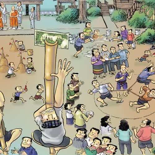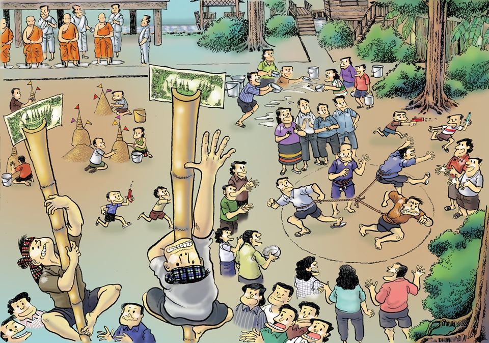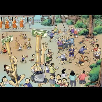 | คำอธิบาย : #งานสงกรานต์แบบวัดๆ #สวัสดีปีใหม่ไทยผู้อ่านทุกท่านครับ #สุขสันต์วันสงกรานต์ #ysbcenter ผู้ให้การสนับสนุน\เมื่อก่อนสงกรานต์บ้านเราโดยเฉพาะในเรือกสวน ไม่ได้เอะอะมะเทิ่ง ไล่สาดน้ำกันแบบระห่ำ เหมือนสมัยนี้ เพราะพื้นที่ส่วนกลางของชุมชนเราก็คือวัดฝางนั่นแหละฮะ\อีกทั้งเครื่องเล่น ปืนฉีดน้ำกระบอกมโหฬารต่างๆก็ยังไม่มี ที่สร้างความสนุกให้กับพวกเราชาวบ้านสวนก็คือการละเล่นไทยๆเรา ที่ปัจจุบันวัยรุ่นคงมองเป็นของเชยๆไปแล้วกระมัง\เช้าวันปีใหม่ไทย ส่วนใหญ่เราก็ไปเริ่มกันที่วัด ไปทำบุญตักบาตรและสรงน้ำพระพุทธรูปบนศาลาวัดเสร็จสรรพ ก็ต่อด้วยการมาสรงน้ำพระสงฆ์กันต่อ\พระในวัดที่รับนิมนต์ ต่างก็มานั่งเรียงแถวตามพรรษา เหล่าชาวบ้านก็จะเดินไปสรงน้ำท่าน โดยการรดน้ำลงที่หัวไหล่ด้วยความนอบน้อมพระท่านก็จะสวดให้ศีลให้พรกันอย่างอิ่มบุญทั้งพระและชาวบ้าน\หลังจากนั้นก็จะมีกิจกรรมที่หลายๆท่านก็คงเคยแล้ว อย่างการก่อเจดีย์ทราย และกิจกรรมบันเทิงก็คือการละเล่นไทยเราแหละ หลักๆก็ มอญซ่อนผ้า ที่สาวๆหนุ่มๆเค้าจะเล่นกัน ผมไม่ได้เขียนในภาพนี้ เพราะหลายท่านก็คุ้นเคยดีอยู่\แต่การละเล่นที่น่าจะสนุกที่สุดคือ การแข่งปีนเสาน้ำมัน เค้าจะเอาเสาตรงอย่างเช่น ลำไผ่ ที่เหลาเสี้ยนออกแล้ว ชะโลมน้ำมันให้ลื่นปรื๊ด แล้วปักไว้อย่างมั่นคงกับพื้น ปลายด้านบนจะเหน็บเงินเอาไว้ สมัยนั้นแค่แบงก์ 20 ก็ปีนกันแบบยอมตายแล้วล่ะฮะ พอถึงเวลาคู่แข่งขันก็แข่งกันปีนเสาน้ำมันเพื่อขึ้นไปเอาเงิน ปีนไปได้หน่อยก็ไหลลื่นลงมา ยิ่งไหลก็ยิ่งเลอะปีนยากขึ้นทุกที เป็นที่สนุกสนานของเหล่าชาวบ้านที่มาดู เรียกเสียง เฮ เฮ ได้ลั่นลานวัดทีเดียว\อีกการละเล่นที่เดี๋ยวนี้ไม่ค่อยได้เห็นแล้ว เรียกว่า ‘แย้ลงรู’ โดยเค้าจะเอาเชือกมัดสามเส้า แต่ละปลายจะผูกเอวผู้เล่นไว้ โดยมีกรรมการคอยเหยียบปมอยู่ ทั้งหมดจะยืนอยู่ในวงกลมที่ขีดไว้บนพื้น เมื่อให้สัญญาณกรรมการจะปล่อยเท้าที่เหยียบปมออก ผู้เล่นทั้งสามคนต้องออกแรงดึงฝ่ายตรงข้ามอีกสองคน บางคนไม่ทันตั้งตัวก็โดนเพื่อนลากซะจนตัวลอย ใครที่แรงดีดึงจนพาตัวเองออกนอกวงได้ก่อน ถือว่าได้รับชัยชนะ เป็นเกมสำหรับหนุ่มๆชาวสวน มาประลองกำลังกันโดยแท้ คนดูและกองเชียร์งี้สนุกสุดๆไปเลย\หวังว่าท่านผู้อ่านจะมีความสุขกันในวันสงกรานต์นี้เช่นกันครับ\ท้ายนี้ ผมขอให้สิ่งศักดิ์สิทธิ์ทั้งหลายโปรดดลบันดาลให้ท่านผู้อ่านประสบแต่ความสุข พลานามัยสมบูรณ์แข็งแรง ในวันปีใหม่ไทยเรานี้นะฮะ\อ้อ...ด้วยความเป็นห่วง ผู้อ