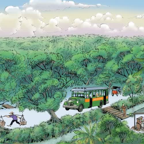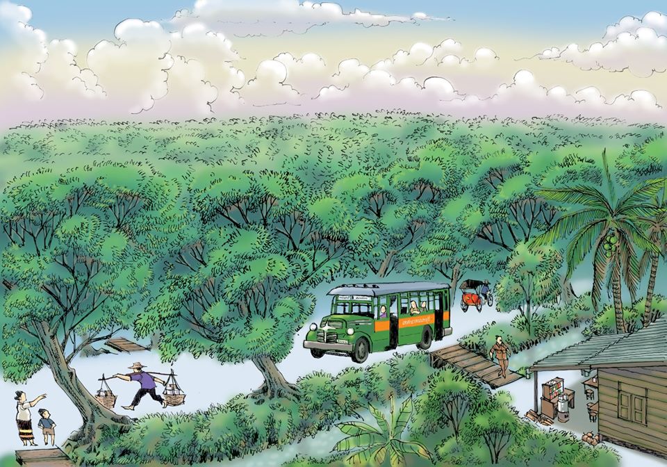 | คำอธิบาย : #ลุงผมเอง #เด็กบ้านสวนภาพวันนี้ท่านผู้อ่านอาจสงสัยว่าทำไมมีแต่ทิวไม้สุดลูกหูลูกตา ไม่มีรายละเอียดอะไรมากมายเอาเสียเลยผมเขียนภาพนี้ตามความทรงจำของพ่อผมครับ เป็นภาพถนนพิบูลสงครามในปีประมาณ 2495-2500ภาพนี้มีสองเรื่องที่ผมอยากคุยถึงเรื่องแรกถนนพิบูลสงครามตำแหน่งในภาพนี้ จะเลยเทคโนโลยีพระจอมเกล้าพระนครเหนือไปทางเมืองนนท์เรานิดหน่อย เมื่อก่อนนั้นถนนสายนี้ร่มครึ้มไปด้วยต้นก้ามปูมหึมา สองข้างฟาก ถนนลาดยางเล็กๆพอรถสวนกันได้ ซึ่งในยุคนั้นก็มีรถไม่มากมายเหมือนปัจจุบัน เพราะการสัญจรต่างๆจะใช้ทางน้ำเป็นหลักเมืองนนท์ตอนนั้นมีรถประจำทางอยู่สายเดียว ดำเนินงานโดยเทศบาลนนทบุรี วิ่งจากท่าน้ำนนท์ไปสนามหลวง ถ้าเทียบกับเดี๋ยวนี้ก็คือ ทับเส้นทางเดียวกับสาย 64 แหละฮะ สักชั่วโมงจะมีสักคัน ผู้โดยสารส่วนใหญ่ก็มักเป็นเหล่าข้าราชการที่เดินทางไปทำงานแหละฮะส่วนพ่อค้าแม่ค้าเองก็ใช้ทางเรือค้าขายไปตามลำคลอง ที่ผมใส่รูปคนหาบของไว้ด้วย เพราะแม่กับพ่อมักเล่าถึงแขกหาบเนื้อสะเต๊ะขายไปตามบ้านต่างๆน่ะฮะส่วนรถเมล์สมัยนั้น พ่อผมจำได้ลางๆว่าเป็นรถยี่ห้อ เดอโซโต้ หรือ ดอดจ์ เป็นตัวถังไม้ สีเขียวใบไม้ทั้งคัน มีคาดสีส้มแดงกลางตัวรถ มีตัวหนังสือเทศบาลนนทบุรีเขียนอยู่ข้างตัวรถ แต่มีสัญญลักษณ์หน่วยงานหรือเปล่า พ่อผมจำไม่ได้ครับภายหลังนายเลิศมาซื้อเส้นทางเดินรถไปก็เปลี่ยนมาเป็นรถเมล์ขาว แล้วก็มาถึงยุค ขสมก. และรถร่วมฯ ในที่สุดเรื่องที่สองก็คือคนขับรถเมล์เขียวนี่แหละฮะ ชายในชุดสีน้ำตาลเดินอาดๆข้ามสะพานข้างถนนนั่น คือ ลุงผมเองครับลุงคนนี้เป็นลูกคนโตของย่า แกเสียชีวิตไปก่อนที่ผมจะเกิดมาทันเห็น และแกก็เป็นคนสร้างวีรกรรมไว้มากมายทีเดียวให้พ่อได้เล่าให้ผมฟังอาทิ แกมักจะเมาทั้งวัน ตอนทำงานเป็นคนขับรถประจำตำแหน่งผู้จัดการบริษัทขนส่งสมัยนั้น เป็นรถ ฟอร์ด คอนซูล แกเมาเสียจนขับรถทะลุลานพระที่นั่งอนันตสมาคมให้เป็นที่ตื่นเต้นแก่เหล่าตำรวจยามกันจ้าละหวั่นและเรื่องในภาพนี้อีกครับ แกเป็นคนขับรถเมล์เขียวที่ว่าเนี่ยแหละ ขากลับจากสนามหลวง ผู้โดยสารติดรถอยู่นิดหน่อยเพื่อกลับท่าน้ำนนท์ เมื่อขับรถถึง กิโล 3 ซึ่งปัจจุบันเป็นท่าจอดรถเมล์สาย 30 ตรงข้ามหมู่บ้านพิบูลย์ สมัยนั้นเป็นที่ตั้งบ้านตายง เปิดขายเหล้ายากาแฟด้วยความอยากเหล้า ลุงผมจอดรถกึก แล้วลงไปหาเหล้ายากินในร้านตายง ปล่อยให้ผู้โดยสารนั่งรอตาละห้อยอยู่ในรถนั่นเอง ผลสุดท้ายเป็นอย่างไรไม่ทราบได้แต่เรื่องนี้พ่อเล่าทีไรก็อดหัวเ