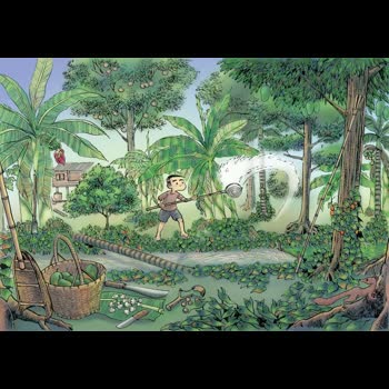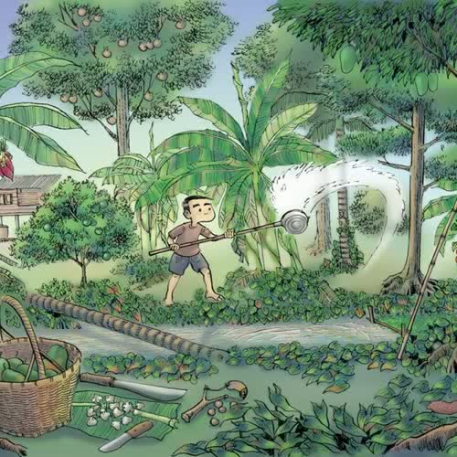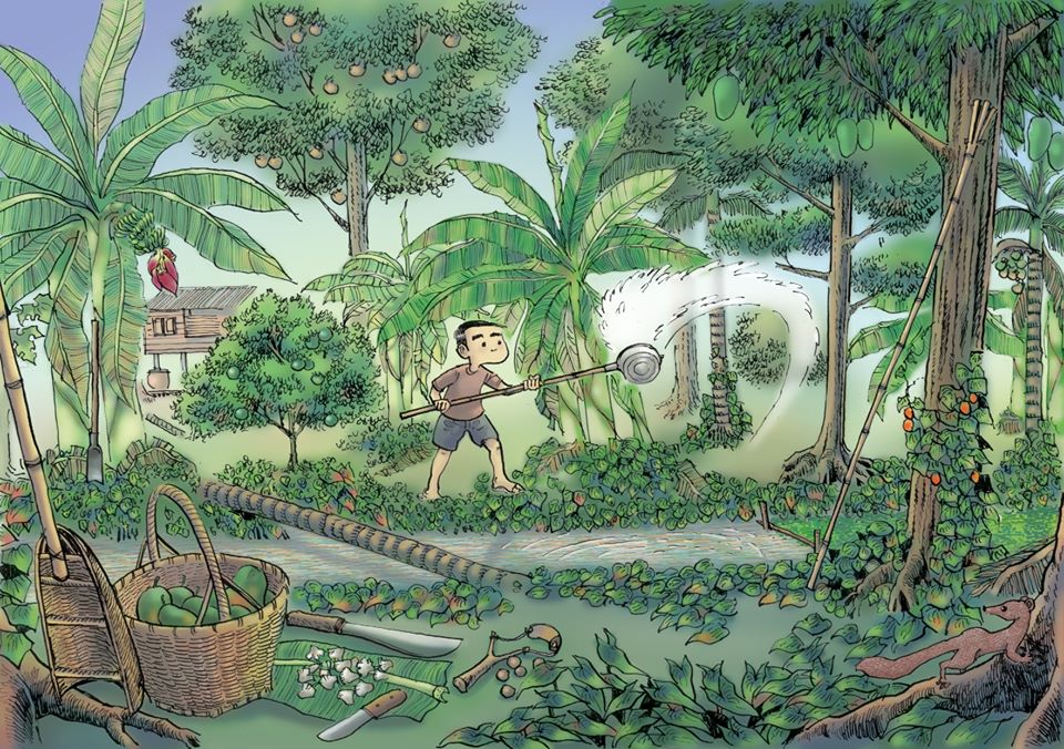 | คำอธิบาย : #เครื่องมือประจำตำแหน่งเด็กสวน #เด็กบ้านสวนเมื่อพูดถึง แก็ดเจ็ต ของคนยุคนี้ ทุกท่านก็คงต้องชี้นิ้วไปที่โทรศัพท์มือถือแทบจะทุกท่าน เพราะแทบเป็นอวัยวะชิ้นที่ 33ของคนเราไปแล้วแต่ถ้าย้อนกลับไป ตำแหน่งเด็กสวน ของผมก็มี แก็ดเจ็ด เหมือนกัน เพียงแต่แทนที่จะใช้นิ้วเข่ยๆ ปาดๆ เลื่อนๆ ปรู๊ดปร็าดไป ก็ใช้แรงแขนทั้งสองข้างบ้าง ขาทั้งสองข้างบ้าง จ้วงๆ สับๆ ฟันๆ ไปตามเท่าที่แรงมีแหละฮะแม้แต่การทำสวนเดี๋ยวนี้ ก็มีเครื่องอำนวยความสะดวกมากมาย จนของยุคของผมนั้นแทบจะต้องเอาไปไว้ในพิพิธภัณฑ์โบราณวัตถุกันแล้ว จนต้องมาชวนคุณผู้อ่านทบทวนกันนี่แหละฮะเริ่มเบสิกเลย โบราณว่า “เข้าเถื่อน อย่าลืมพร้า” #พร้า เป็นอะไรที่ทุกท่านก็รู้จักแหละฮะ สารพัดประโยชน์ ทั้งดายหญ้า ปอกมะพร้าว ตัดกล้วย หรือแม้แต่ยามที่ไม่มีเสียม ก็ยังใช้ปลายคมพร้า ขุดดินนิ่มๆเอาไส้เดือนมาตกปลาได้แต่ถ้างานละเอียดขึ้นมาอีกนิด ก็ต้อง #มีดพับ ที่วางอยู่ใกล้ๆกันน่ะฮะ อันนี้ก็ใช้ได้ทั้งเจียนใบตอง ปอกเปลือกผลไม้ ควั่นกิ่งตอน หรืออื่นๆแล้วแต่จะจินตนาการประโยชน์แห่งของมีคมได้ ผมได้มรดกตกทอดจากย่ามาเล่มนึง ปัจจุบันก็ยังใช้อยู่บ้างเวลาเจียนใบตองทำกระทงห่อหมกฮะ คมกริบจนแม่ต้องเตือนทุกครั้งที่เห็นผมหยิบไปใช้เลยทีเดียว#หนังกะติ๊ก อันนี้กึ่งของเล่นกึ่งอาวุธฮะ ผมไม่เคยใช้ยิงนกหรือกระรอกหรอกฮะ เพราะขี้กลัวขี้สงสารมาแต่เด็ก แต่เป้าของผมมักเป็นมะม่วงเขียวเสวย เอาไว้ฝึกมือ ยิงกระสุนดินปั้นเองตากแห้ง วันไหนยิงให้ตัดขั้วมะม่วงได้นี่วันนั้นดีใจเจียนตายเลยทีเดียว แต่ขืนยิงมะม่วงอกร่อง หรือยายกล่ำที่ใช้กินตอนสุกนี่เสียของหมดฮะผู้ใหญ่ดุหูชาแน่#เสียมขุดดิน ผมพาดไว้กับดงกล้วยนั่น เพื่อขุดหน่อมาปลูกบ้าง กับยามหาไส้เดือนมาตกปลาครับ#แครง ก็อันที่ผมกำลังจ้วงน้ำอยู่นั่นแหละฮะ เด็กบางคนสมัยนี้ก็ไม่รู้จักเสียแล้ว อันนี้ใช้บ่อยสุดเพราะ ต้องช่วยพ่อรดน้ำท้องร่องให้ชุ่มชื่นทั้งต้นไม้และใจเราเอง หน้าน้ำรดก็ใช้ตักขี้เลนใบทองหลางจากก้นคลองขึ้นมาโปะรอบต้นไม้ ปุ๋ยชั้นดีเชียวฮะ#ไม้จำปา ตะกร้อนี่เราจะใช้กันบ่อยๆอยู่แล้วเพราะสอยผลไม้เกือบทุกอย่างและทุกท่านคงคุ้นชิน ส่วนไม้จำปานี่ ทำจากไม้ไผ่ผ่าปลายเป็นสี่แฉก แล้วเอาจุกไม้ขนาดที่ใหญ่กว่ารูปล้องไผ่หน่อยอัดเข้าไปให้ปลายแฉกบานออกมาเล็กน้อย ถ้าขี้เกียจก็ใช้ไม้แข็งๆง้างง่ามมันไว้ให้ปลายบานนิดหน่อย เหลาเจียนผิวในให้เรียบหมดเสี้ยน ผลไม้ที่สอยจะได้ไม่ช้ำมีแผล ไม้จำปานี่เราจะใช้