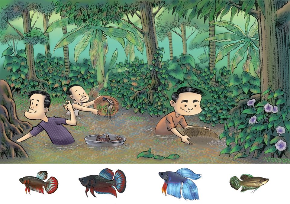 | คำอธิบาย : #หานักสู้ #เด็กบ้านสวนชีวิตในสวนเราเป็นอะไรที่ง่ายๆ ไม่ซับซ้อนเท่าไหร่ ยิ่งเป็นเด็กก็ยิ่งง่ายเข้าไปใหญ่ กิน เล่น นอน ซ้ำไปซ้ำมาเป็นกิจวัตร อยู่แค่นั้นเล่นอะไรทีก็เล่นไปทุกวี่วัน พอเบื่อก็เลิกไปเล่นอย่างอื่นต่อ แล้วก็วนไปเรื่อยๆตามฤดูกาล ตะลอนๆหาของเล่นอยู่ในท้องร่องสวนกันสายจดเย็นย่ำแม่เรียกไปอาบน้ำกินข้าวนั่นแหละฮะเดินไปตามคันร่องสวน สายตาก็สอดส่ายหาอะไรไปเรื่อยเปื่อย โดยเฉพาะบางอย่างในผืนน้ำ เราอาจเห็นเจ้าฟองอากาศเล็กๆลอยเป็นแพอยู่ตามดงผักบุ้งหรือกระจุกรากไม้ ในที่น้ำนิ่งและร่มรำไรหน่อย นั่นคือ หวอดปลากัด ที่หลายท่านคุ้นเคยนั่นแหละฮะเห็นดังนั้น เราจะรีบวิ่งจู๊ดกลับบ้านไปหากระจาดหรือฝาชีเก่าไม่ใช้แล้วของแม่ แล้วก็ดิ่งกลับไปร่องน้ำนั้นอย่างทันที เพราะรู้ว่า ตรงนั้นมีปลากัด รอท่าให้ช้อนอยู่ปลากัดตัวผู้ที่สมบูรณ์จะสร้างหวอดเพื่อแสดงให้ตัวเมียเห็นว่ามันแข็งแรงพร้อมที่จะผสมพันธุ์แล้วน่ะครับหย่อนตัวลงท้องร่องอย่างเบาๆไม่ให้ปลาข้างล่างตื่น แล้วค่อยๆเอาอุปกรณ์ที่หาได้ช้อนอย่างเบามือไปใต้หวอดที่เห็นนั่น เราก็จะได้ปลากัดมาเลี้ยงชื่นชมในขวดโหลไว้ดูมันพองตัวอวดสีสันได้อย่างไม่ยากเย็นเท่าไหร่แต่ปลากัดที่ได้ก็ไม่ใช่ปลากัดที่มีสีสันสวยสดอะไรมากมายนักหรอกฮะ เพราะปลากัดตามร่องสวนนั่นเราเรียกว่า ปลากัดป่าหรือปลาลูกทุ่งปลากัดนี่มีอยู่หลายประเภทเหมือนกันฮะ ทั้งปลากัดลูกทุ่ง ปลากัดหม้อ ปลากัดสังกะสี ปลากัดจีน และปลากัดแฟนซีสวยงามที่เดี๋ยวนี้นิยมกันมาก ผมเขียนรูปประกอบไว้ด้านล่าง 3 ประเภท และปลาอื่นที่เป็นญาติๆกันกับปลากัดอีก หนึ่งตัว นะฮะปลากัดลูกทุ่ง ตัวจะไม่ใหญ่มากสีสันก็มีแค่ปลายครีบหลังหรือเรียกกระโดง ปลายครีบท้องที่เรียกตะเกียบ เพราะเรียวยาวเป็นคู่เหมือนตะเกียบ และครีบหาง ปลากัดลูกทุ่งแต่ละถิ่นก็มีสีไม่เหมือนกันนะฮะ ทั้งของเหนือ กลาง อีสาน ใต้ และทางมหาชัยปลากัดหม้อ มีรูปร่างและลำตัวที่ใหญ่กว่า สีสันจะเข้มทะมึนกว่า ปลากัดลูกทุ่ง อันนี้หาช้อนไม่ได้ตามท้องร่องหรอกฮะ เพราะเค้าเลี้ยงไว้กัดกัน เว้นมีคนโยนลงท้องร่องก็อาจไปผสมกับปลาลูกทุ่งได้เป็น เป็นปลาลูกผสมเรียก ปลากัดสังกะสีปลากัดสังกะสี เป็นปลาลูกผสมของปลากัดหม้อกับปลากัดลูกทุ่ง อันนี้ผมไม่ได้วาดรูปประกอบไว้นะฮะ รบกวนท่านผู้อ่านต้องนึกภาพเอาเองนะครับปลากัดจีน อันนี้เกิดจากการผสมต่อๆมาจนครีบยาว สีสันสวยงาม ที่เรียกปลากัดจีนคงเพราะครีบที่ยาวพริ้วสีสันจัดจ้านเหมือนชุด