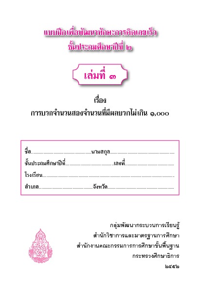 | ชื่อเรื่อง : แบบฝึกเพื่อพัฒนาทักษะการคิดเลขเร็ว ชั้นประถมศึกษาปีที่ 2 เล่ม 3 |