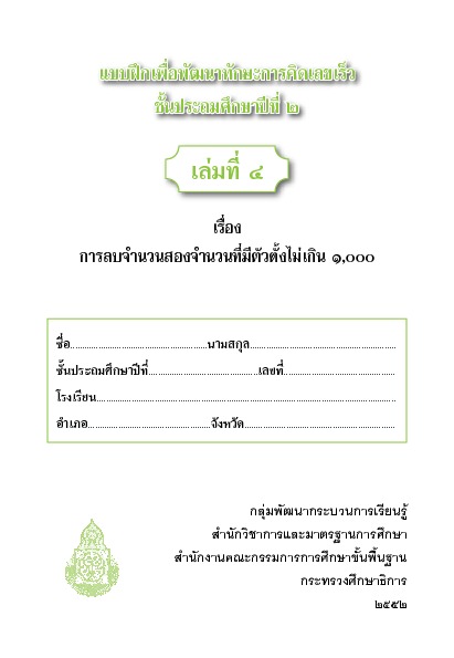"แบบฝึกเพื่อพัฒนาทักษะการคิดเลขเร็ว ชั้นประถมศึกษาปีที่ 2 เล่ม 4".