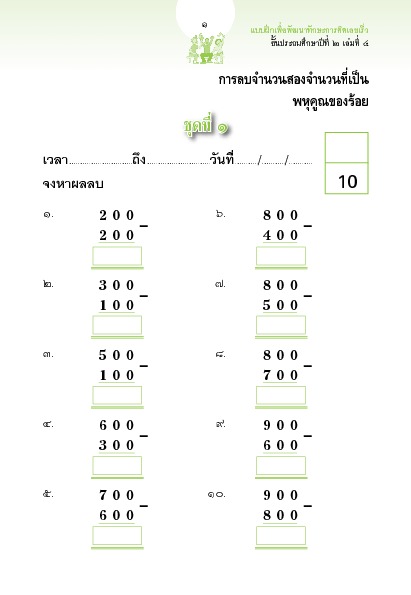 | คำสำคัญ : การคิดเลขเร็ว, การลบ, การกระจายหนึ่งหลัก, ประถม2, การกระจายสองหลัก, คณิตศาสตร์, พหุคูณของร้อย, การลบจำนวนสองจำนวน |