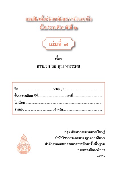 | ชื่อเรื่อง : แบบฝึกเพื่อพัฒนาทักษะการคิดเลขเร็ว ชั้นประถมศึกษาปีที่ 2 เล่ม 7 |
