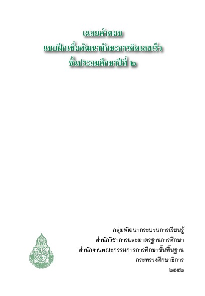 | ชื่อเรื่อง : เฉลยคำตอบแบบฝึกเพื่อพัฒนาทักษะการคิดเลขเร็ว ชั้นประถมศึกษาปีที่ 2 |