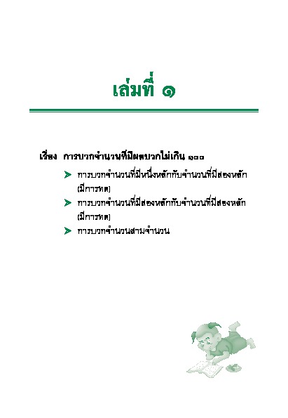 | คำอธิบาย : เล่มที่ 1 เรื่อง การบวกจำนวนที่มีผลบวกไม่เกิน 100เล่มที่ 2 เรื่อง การลบจำนวนสองจำนวนที่มีตัวตั้งไม่เกิน 100 (มีการกระจาย)เล่มที่ 3 เรื่อง การบวกจำนวนสองจำนวนที่มีผลบวกไม่เกิน 1,000เล่มที่ 4 เรื่อง การลบจำนวนสองจำนวนที่มีตัวตั้งไม่เกิน 1,000เล่มที่ 5 เรื่อง การคูณเล่มที่ 6 เรื่อง การหารเล่มที่ 7 เรื่องการบวก ลบ คูณ หารระคน |