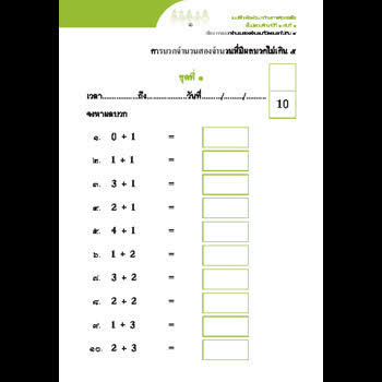 แบบฝึกเพื่อพัฒนาทักษะการคิดเลขเร็ว ชั้นประถมศึกษาปีที่ 1 เล่ม 1 ได้รับใบอนุญาตภายใต้ ให้เผยแพร่-โดยต้องระบุที่มาแต่ห้ามดัดแปลงและห้ามใช้เพื่อการค้า 3.0 Thailand.