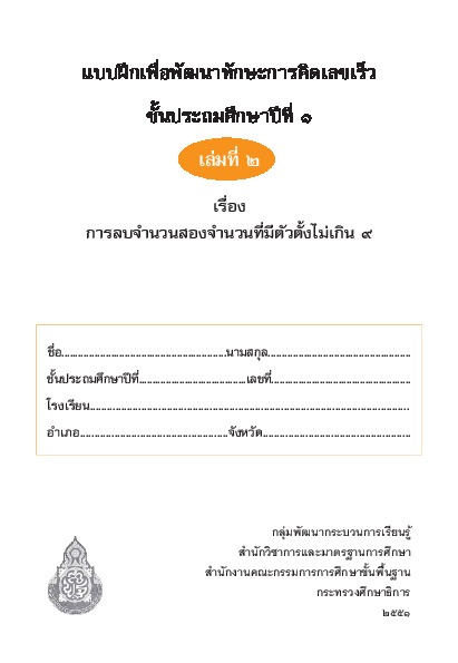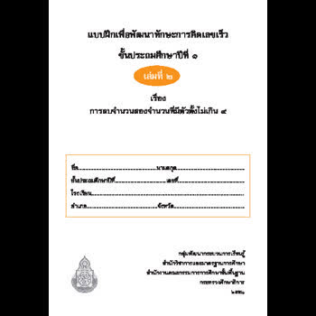 | ชื่อเรื่อง : แบบฝึกเพื่อพัฒนาทักษะการคิดเลขเร็ว ชั้นประถมศึกษาปีที่ 1 เล่ม 2 |