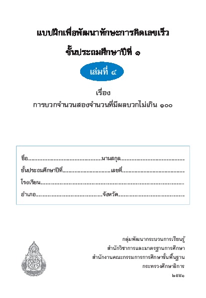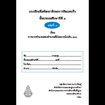| ชื่อเรื่อง : แบบฝึกเพื่อพัฒนาทักษะการคิดเลขเร็ว ชั้นประถมศึกษาปีที่ 1 เล่ม 4 |