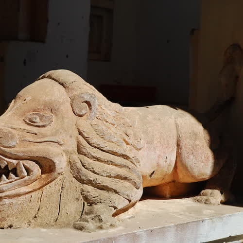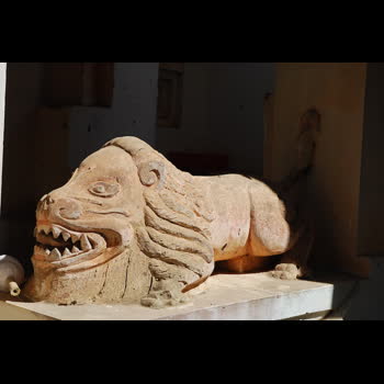 คำอธิบาย : ปูนปั้นรูปสิงโตหมอบ ตั้งอยู่ด้านหน้าทางเข้าอุโบสถวัดเกษมสำราญ อำเภอตระการพืชผล จังหวัดอุบลราชธานี งานศิลปกรรมปูนปั้นท้องถิ่นที่อยู่ในศาสนาคาร |