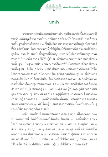 "คู่มือการใช้แบบฝึกเพื่อพัฒนาทักษะการคิดเลขเร็ว ชั้นประถมศึกษาปีที่ 1".