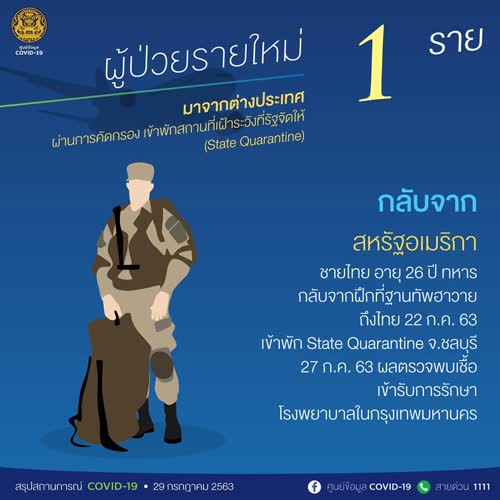 (2563). "สรุปสถานการณ์ COVID-19 วันที่ 29 กรกฎาคม 2563".