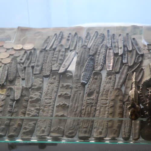 | คำอธิบาย : เงินตราที่ใช้กันในอดีต มีรูปร่างคล้ายเรือ มักทำมาจากทองแดง ทองเหลือง สัมฤทธิ์ หรือเนื้อเงิน มีชื่อเรียกและมูลค่าแตกต่างกันออกไป เช่น เงินลาด เงินฮาง เงินฮ้อย เงินเรือ เงินตราเหล่านี้เก็บรวบรวมและจัดแสดงไว้ที่พิพิธภัณฑ์พื้นบ้านวัดศรีสุพนอาราม อำเภอม่วงสามสิบ จังหวัดอุบลราชธานี |