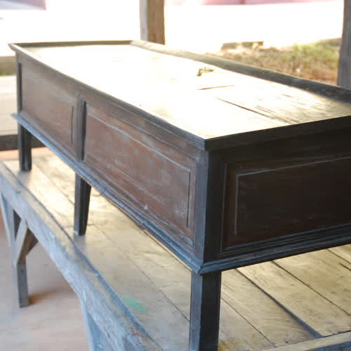 | คำอธิบาย : หีบไม้สำหรับใส่เสื้อผ้า มีลักษณะเป็นหีบรูปทรงสี่เหลี่ยม มีขาตั้ง ทำมาจากไม้ เป็นเครื่องใช้โบราณของชาวอีสานสำหรับเก็บเสื้อผ้า ทางวัดปุญญานิวาส อำเภอตระการพืชผล จังหวัดอุบลราชธานี ได้เก็บรวบรวมไว้เพื่อให้ศึกษาเรียนรู้ |