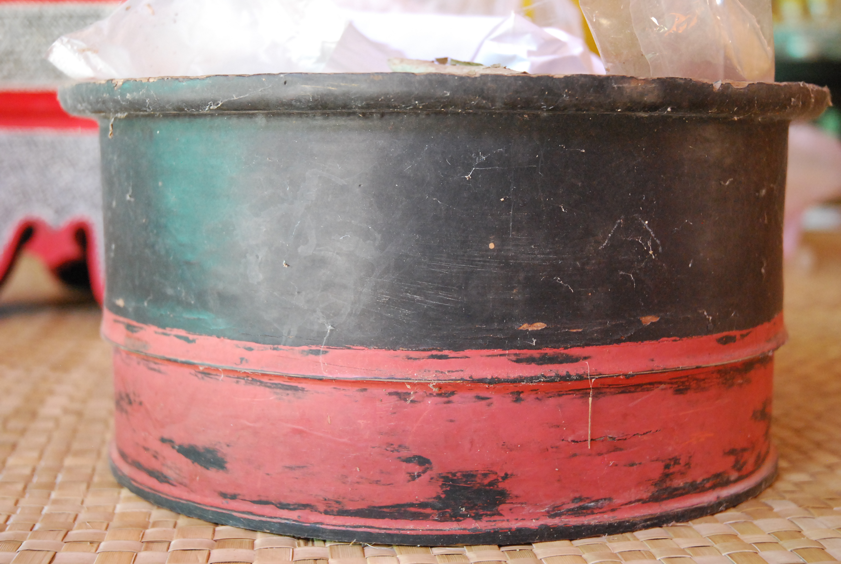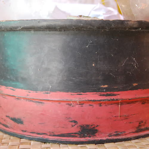 | คำอธิบาย : แอบหมาก แอบยา เป็นเครื่องใช้อีสาน ลักษณะทรงกระบอกกลม ใช้บรรจุหรือเก็บหมากพลู ยาเส้นรวมทั้งอุปกรณ์ในการเคี้ยวหมากและสูบยาเส้น เช่น ใบตองกล้วยแห้ง มีดสะนาก ตะบันหมาก เนื่องจากผู้เฒ่าผู้แก่สมัยโบราณนั้นนิยมทั้งเคี้ยวหมากหรือสูบยาเส้น จึงต้องมีเครื่องใช้สำหรับจัดเก็บอุปกรณ์เหล่านี้ แอบหมากแอบยาเส้นนี้ จัดเก็บไว้ที่วัดปุญญานิวาส อำเภอตระการพืชผล จังหวัดอุบลราชธานี |