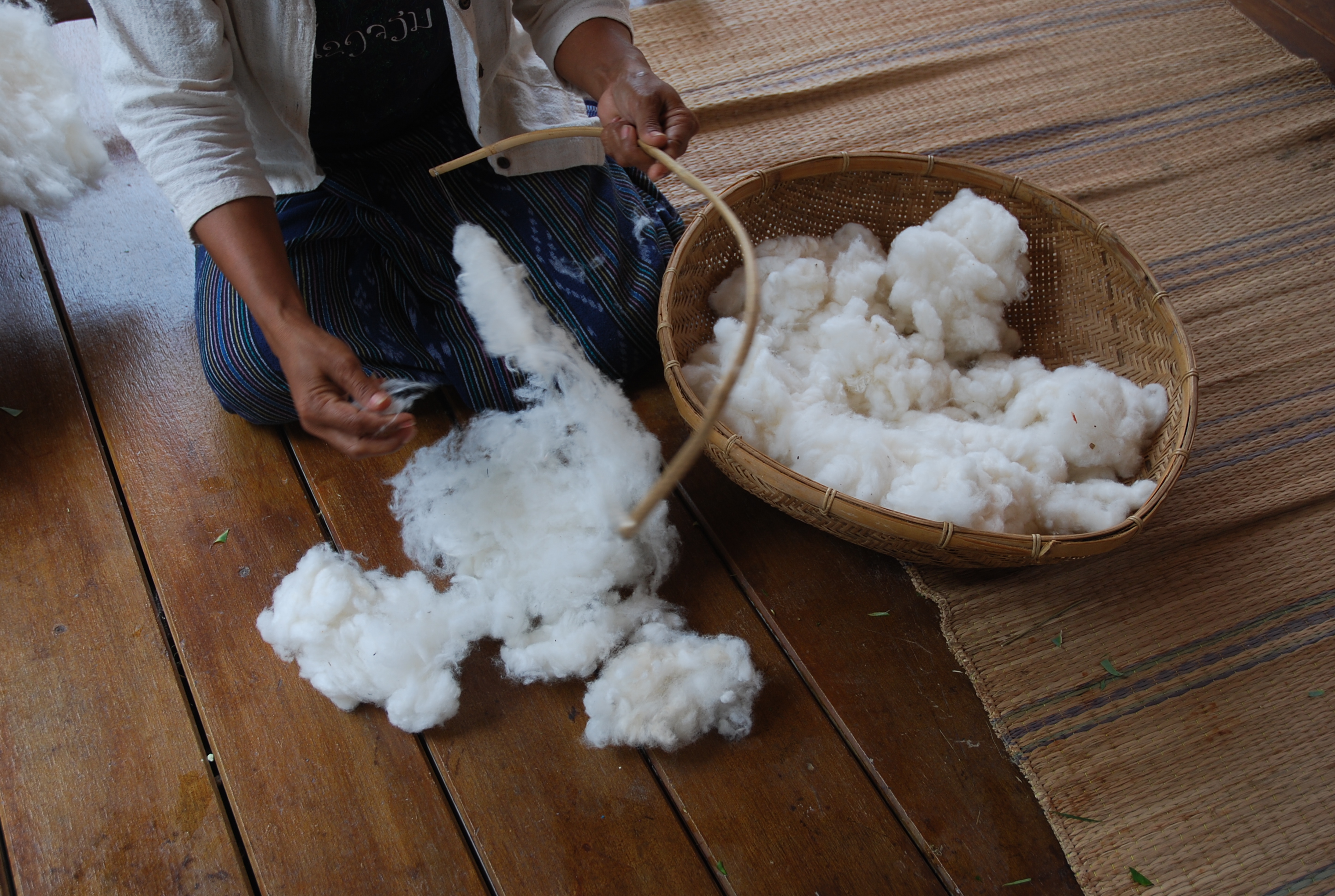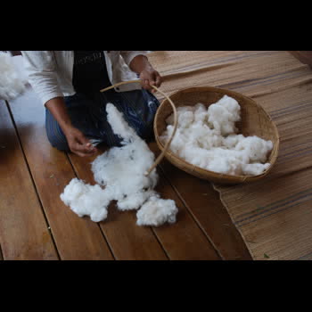 | คำอธิบาย : การดีดฝ้ายของชุมชนทอผ้าฝ้ายอำเภอโขงเจียม จังหวัดอุบลราชธานี ที่ทำสืบต่อกันมานาน คือการทำให้ฝ้ายฟูขึ้นปุยก่อนนำไปล้อหรือม้วนเพื่อรอการเข็นต่อไป เป็นการแยกเศษสิ่งตกค้างออกเพื่อให้เส้นฝ้ายสะอาดขึ้น การดีดฝ้ายจะใช้อุปกรณ์ที่เรียกว่ากงดีดฝ้ายที่ทำด้วยไม้ไผ่เหลาแบนส่วนปลายเรียว ผูกเชือกที่ปลายทั้งสองข้างให้โค้งเข้าหากันลักษณะคล้ายคันธนู หรือคันเบ็ด เชือกที่ขึงไว้นี้จะเป็นสายสำหรับดีดฝ้าย |