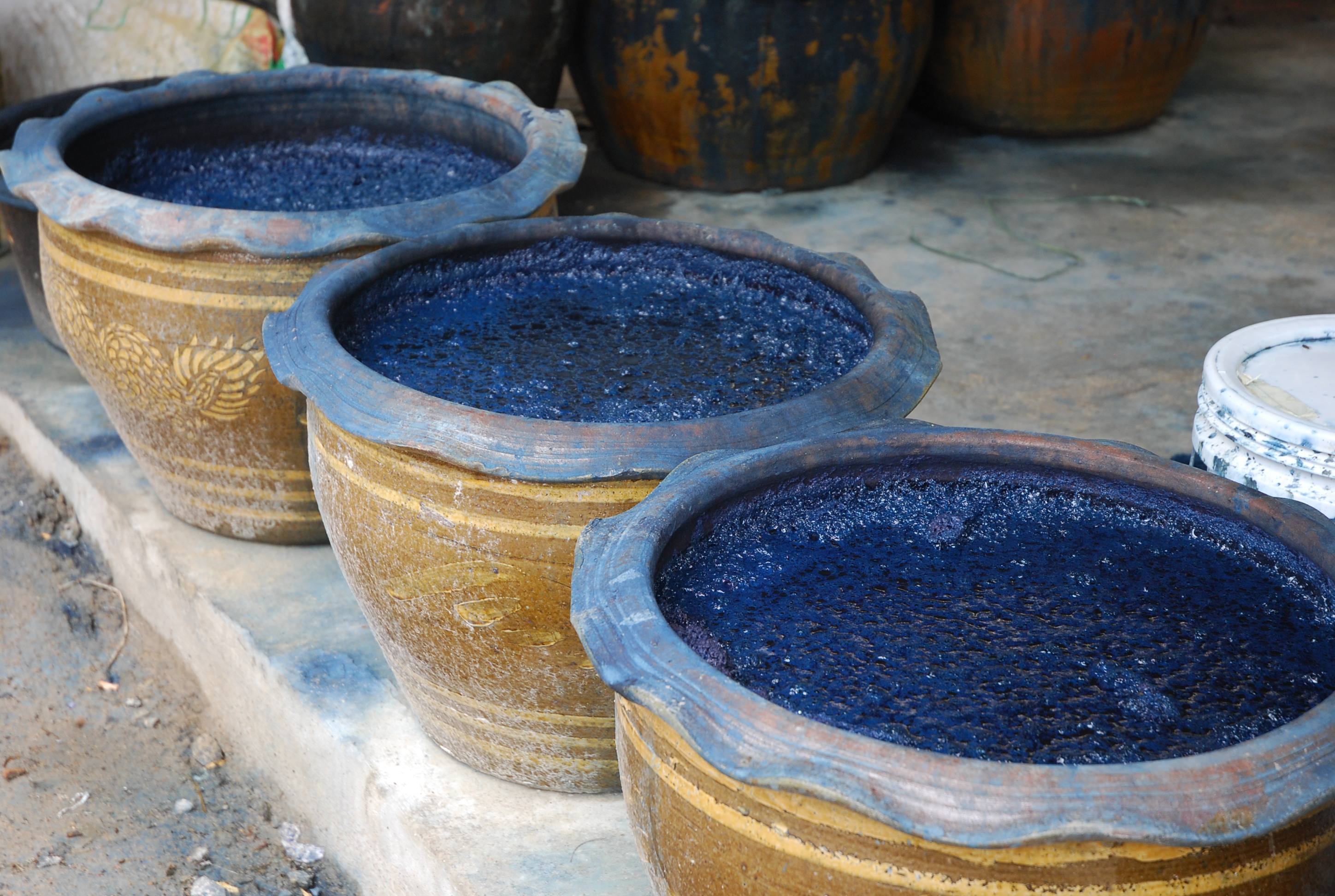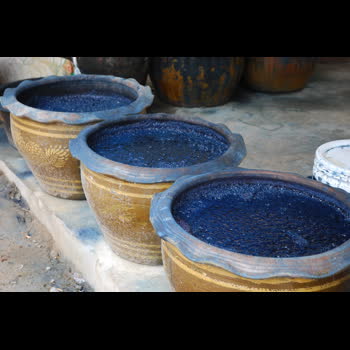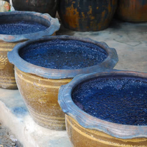 | คำอธิบาย : คราม เป็นไม้พุ่มที่สามารถนำกิ่งและใบมาใช้ย้อมสีผ้าได้ ซึ่งจะให้สีโทนน้ำเงิน การย้อมผ้าด้วยครามจะเริ่มด้วยการนำกิ่งและใบครามมาหมักน้ำทิ้งไว้ 1 คืน จากนั้นจะนำกิ่งและใบครามออกให้เหลือแต่น้ำที่แช่คราม นำปูนเคี้ยวหมากมากวนรวมกับน้ำแช่ครามจนได้ที่แล้วทำการกระทุ้งหรือยอกให้น้ำครามขึ้นฟองอย่างต่อเนื่องใช้เวลานานราว 2 ชั่วโมง พักน้ำครามไว้อีก 1 คืน ให้ตกตะกอน ตักน้ำใส ๆ ออกให้เหลือแต่เนื้อคราม กรองเนื้อครามด้วยผ้าขาวบาง เนื้อครามนี้จะนำไปใช้ย้อมผ้า |