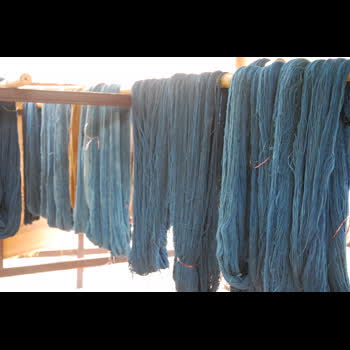 | คำอธิบาย : เส้นฝ้ายที่จะนำมาย้อมสีธรรมชาติจะต้มด้วยน้ำสบู่หรือผงซักฟอกเพื่อล้างไขมันออกก่อน จากนั้นจึงนำมาย้อมด้วยสีธรรมชาติ การย้อมด้วยครามจะให้โทนสีน้ำเงิน เมื่อย้อมได้สีตามที่ต้องการแล้วจึงนำไปทำเส้นยืนหรือเส้นนอนเพื่อทอเป็นผืนผ้าต่อไป |