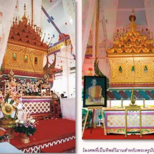 | คำอธิบาย : การทำโลงศพมอญที่เป็นวิมานทองบนสรวงสวรรค์ในงานพระราชทานเพลิงศพพระครูปัญญานนทคุณ บรรดาศิษย์ได้สร้างโลงศพมอญสำหรับบรรจุสรีระของพระเถระผู้มรณะ โลงศพมอญเป็นงานศิลปะชั้นสูงของชาวไทยเชื้อสายมอญ มองด้านหน้าและด้านหลังจะมีลักษณะเป็นรูปวิมานหรือปราสาทเรือนยอด ตัวโลงประดับด้วยลายมอญปิดทองอร่ามงดงาม เจาะเป็นช่องหน้าต่าง 3 ช่อง ฝาทำเป็นยอดปราสาทตามแบบสถาปัตยกรรมมอญที่ทำหลังคาซ้อนกันหลายชั้น ประดับด้วยลายฉลุแบบมอญที่วิจิตรงดงาม มียอดสีทองที่ล้อมด้วยดอกไม้ไหว ด้านขวางของโลงมีลักษณะคล้ายดอกผักบุ้ง หรือปะกาววุ่น ในภาษามอญ ด้านล่างสอบเข้าด้านบนบานออก มอญเรียกโลงศพแบบนี้ว่า อาลาบ๊อกซุ้มบันแถลงของฝามีการฉลุลายรูปพระเจดีย์ ซึ่งใช้สำหรับงานศพพระ ถ้าเป็นพระศพของพระมหากษัตริย์หรือพระราชวงศ์จะประดับด้วยลายฉลุเป็นรูปมงกุฎ สำหรับคนทั่วไปประดับด้วยลายฉลุรูปพรรณพฤกษาชาวไทยเชื้อสายมอญที่บ้านคลองหม่อมแช่ม บ้านคลองลำลาดสวาย ตำบลขุนศรีและตำบลไทรใหญ่ อำเภอไทรน้อย ยังคงมีช่างที่มีความรู้ความชำนาญในงานศิลปะฉลุและแกะสลักลายกระดาษประดับที่สวยงาม เป็นเอกลักษณ์ของชุมชนที่สามารถนำไปประดิษฐ์เป็นงานศิลปะอื่น ๆ เช่น การทำแท่นหรือบุษบกประดิษฐานพระพุทธรูป การทำโน่หรือหางหงส์หรือที่ภาคเหนือเรียกว่าตุงด้วยกระดาษฉลุประดับลวดลายแขวนไว้ที่เสาหงส์ที่วัดในเทศกาลสงกรานต์ |