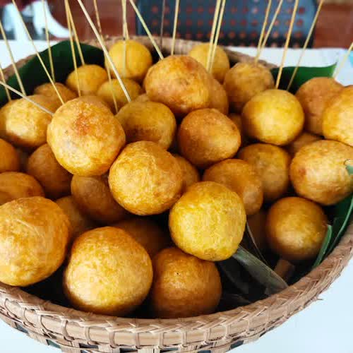 | คำอธิบาย : ไปรกะซัง คือขนมโบราณซึ่งเป็นภูมิปัญญาของชาวกูย จ.ศรีสะเกษ มีส่วนผสมหลักเป็นแป้งเหนียวและมีไส้ข้างในซึ่งทำจากการนำมะพร้าวอ่อนมาผัดเข้ากับน้ำตาล หน้าตาของขนมไปรกะซังคล้ายขนมไข่เต่าหรือไข่นกกระทาแต่มีขนาดใหญกว่า และมีความเหนียวและหนากว่าเล็กน้อย |