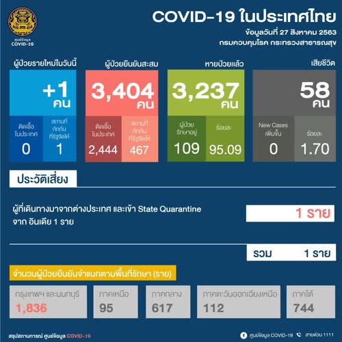 "COVID-19 ในประเทศไทย ข้อมูลวันที่ 27 สิงหาคม 2563".
