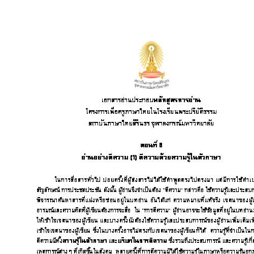 | คำอธิบาย : หลักสูตรการอ่าน สถาบันภาษาไทยสิรินธร ตอนที่ 8 อ่านอย่างตีความ (1) ตีความด้วยความรู้ในตัวภาษา - เอกสารอ่านประกอบ |