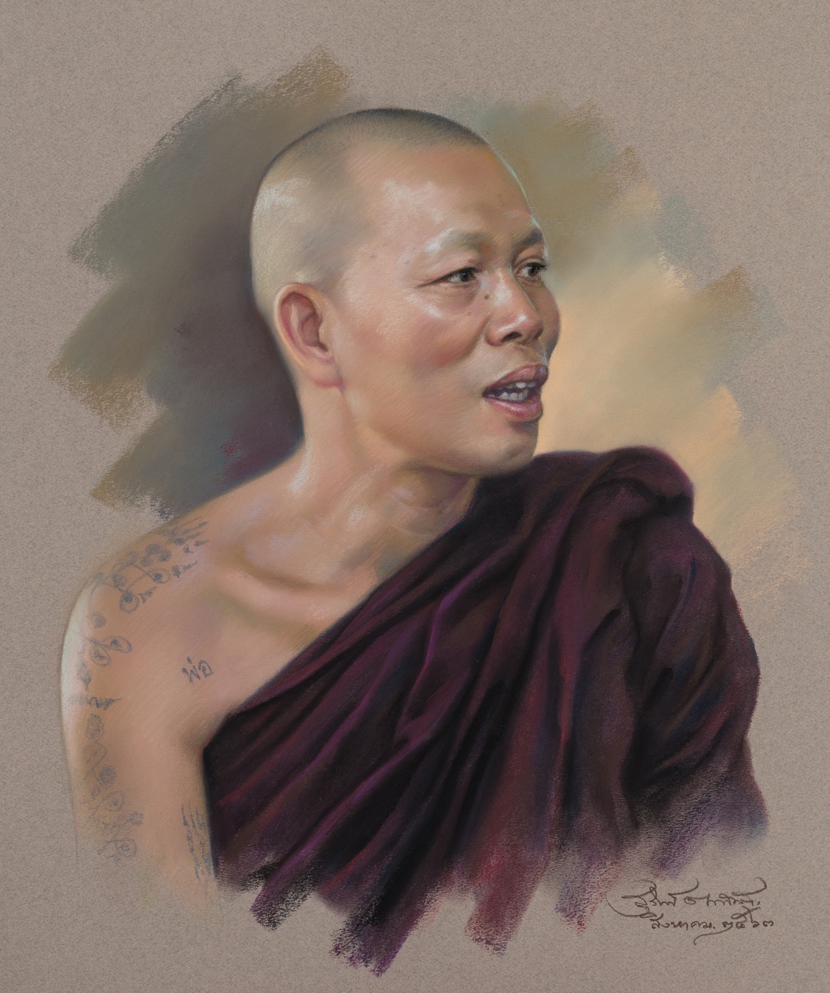| คำอธิบาย : พระครูบาแสงชัย รกฺขิตจิตโตเจ้าอาวาสวัดป่าหม่อมเจ้าสมาคม กิติยากรเลขที่ 141 หมู่ 11 ตำบลคูเมือง อำเภอหนองบัวแดง จังหวัดชัยภูมิ 36210เทคนิคสีชอล์กศิลปินอาจารย์สุวิทย์ ต่างสมบัติกลุ่มศิลปินสองแผ่นดิน |