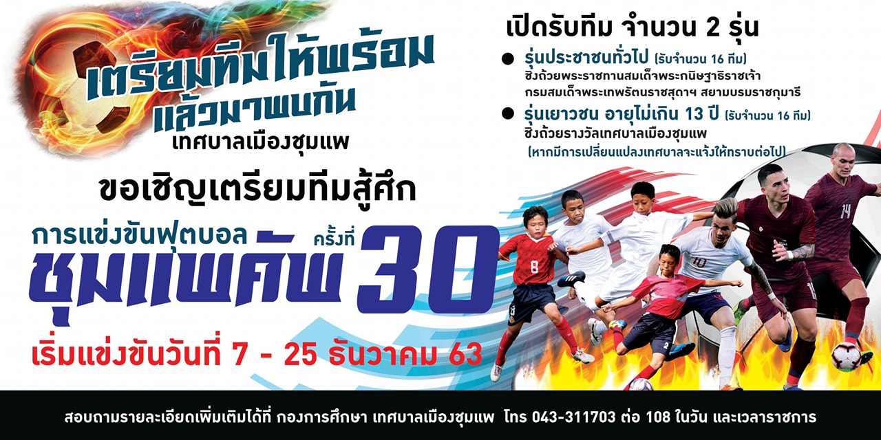 | คำอธิบาย : เทศบาลเมืองชุมแพ ขอเชิญเตรียมทีมสู้ศึก การแข่งขันฟุตบอลชุมแพคัพ ครั้งที่ 30 ประจำปี 2563 เริ่มแข่งขันวันที่ 7-25 ธันวาคม 2563 เปิดรับทีม จำนวน 2 รุ่น รุ่นเยาวชน อายุไม่เกิน 13 ปี (รับจำนวน 16ทีม) ชิงถ้วยรางวัลเทศบาลเมืองชุมแพ และ รุ่นประชาชนทั่วไป (รับจำนวน 16 ทีม ) ชิงถ้วยพระราชทานสมเด็จพระกนิษฐาธิราชเจ้า กรมสมเด็จพระเทพรัตนราชสุดาฯ สยามบรมราชกุมารี |