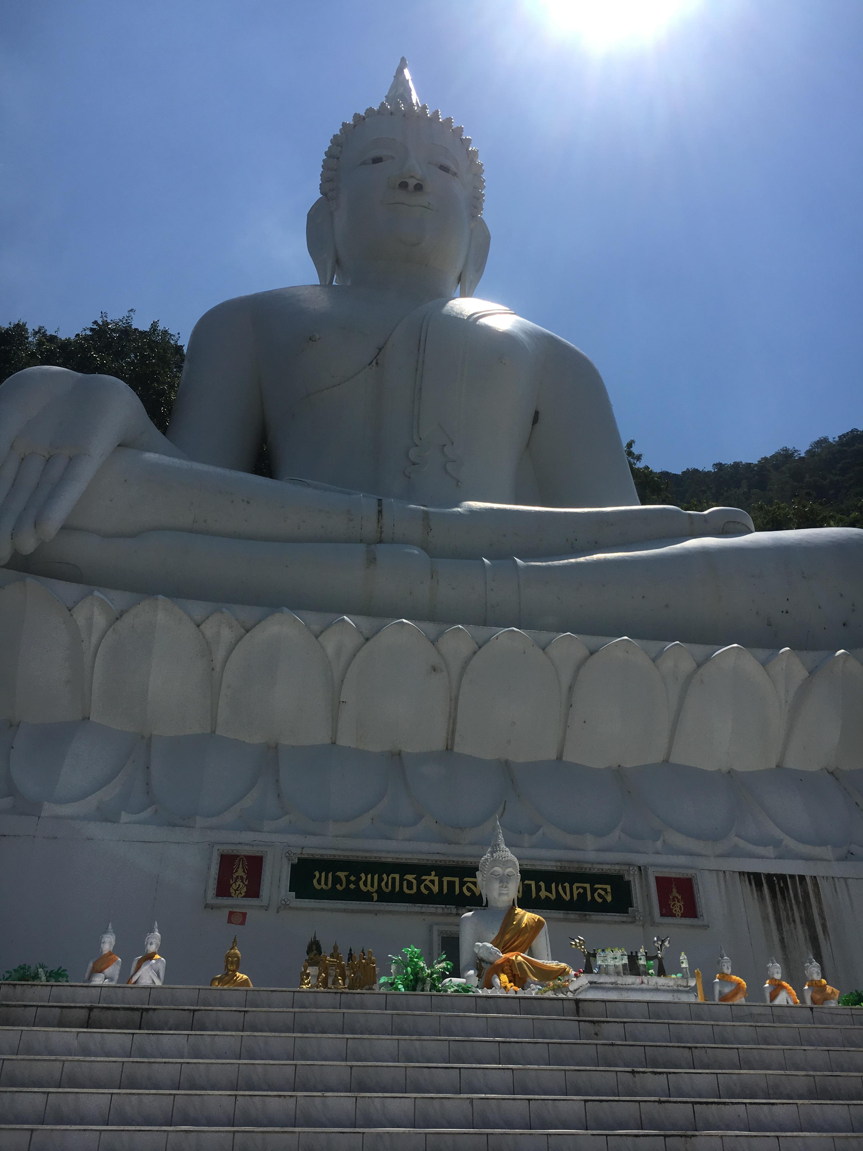 | คำอธิบาย : พระพุทธสกลสีมามงคล เป็นพระพุทธรูปปางประทานพร ประดิษฐานอยู่ที่วัดเทพพิทักษ์ปุณณาราม ตั้งอยู่บนเขาสีเสียดอ้า ถูกสร้างขึ้นเมื่อปีพุทธศักราช 2510 เพื่อน้อมเกล้าฯถวายโดยพระราชกุลเป็นพระบรมราชานุสรณ์พิเศษ แด่พระบาทสมเด็จพระปรมินทรมหาภูมิพลอดุลยเดช มหิตลาธิเบศรามาธิบดี จักรีนฤบดินทร สยามินทราธิราช บรมนาถบพิตร (รัชกาลที่ 9) และได้รับพระราชทานนามว่า “พระพุทธสกลสีมามงคล” ซึ่งคนทั่วไปรู้จักกันดีในนาม หลวงพ่อขาว หรือ หลวงพ่อใหญ่ |