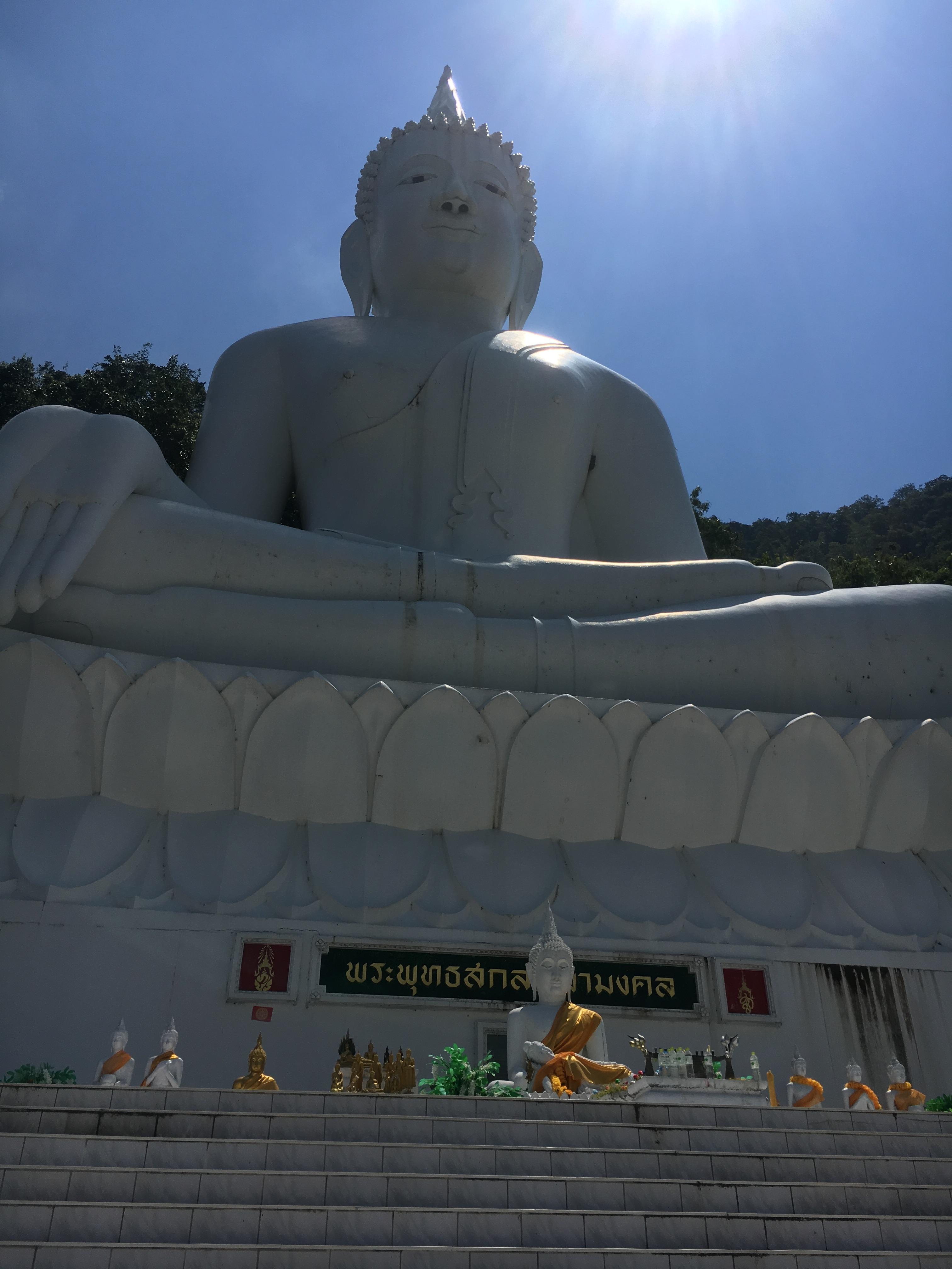 | คำอธิบาย : พระพุทธสกลสีมามงคล เป็นพระพุทธรูปปางประทานพร ประดิษฐานอยู่ที่วัดเทพพิทักษ์ปุณณาราม ตั้งอยู่บนเขาสีเสียดอ้า ถูกสร้างขึ้นเมื่อปีพุทธศักราช 2510 เพื่อน้อมเกล้าฯถวายโดยพระราชกุลเป็นพระบรมราชานุสรณ์พิเศษ แด่พระบาทสมเด็จพระปรมินทรมหาภูมิพลอดุลยเดช มหิตลาธิเบศรามาธิบดี จักรีนฤบดินทร สยามินทราธิราช บรมนาถบพิตร (รัชกาลที่ 9) และได้รับพระราชทานนามว่า “พระพุทธสกลสีมามงคล” ซึ่งคนทั่วไปรู้จักกันดีในนาม หลวงพ่อขาว หรือ หลวงพ่อใหญ่ |