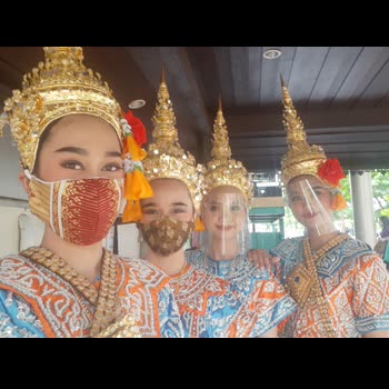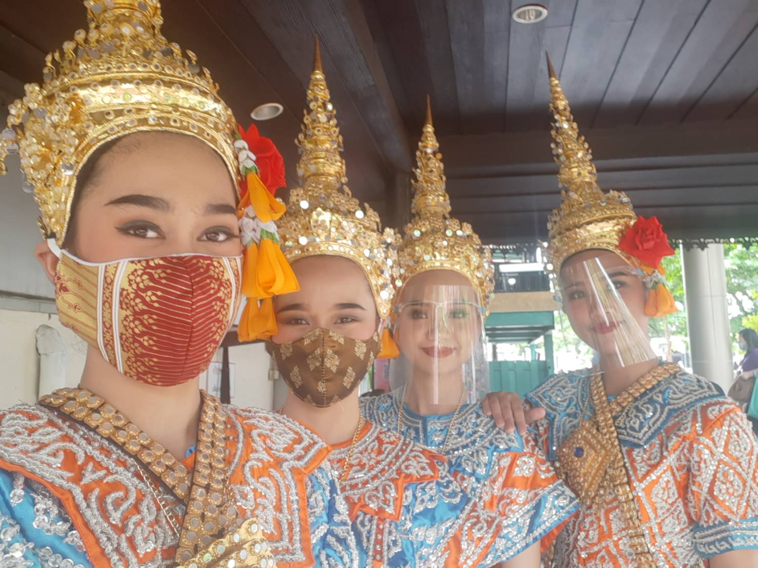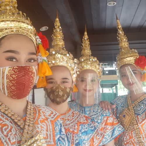 | คำอธิบาย : นางรำในยุคที่มีการระบาดของโรค โควิด 19 โดยจะมีการใส่หน้ากากผ้า และอุปกรณ์ป้องกันใบหน้า ตามนโยบายของรัฐบาล |