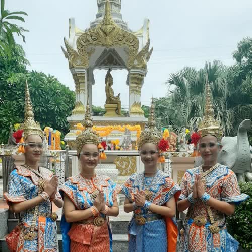 | คำอธิบาย : นางรำในยุคที่มีการระบาดของโรค โควิด 19 โดยจะมีการใส่หน้ากากผ้า และอุปกรณ์ป้องกันใบหน้า ตามนโยบายของรัฐบาล |