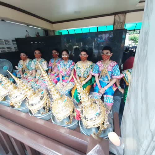 | คำอธิบาย : นางรำในยุคที่มีการระบาดของโรค โควิด 19 โดยจะมีการใส่หน้ากากผ้า และอุปกรณ์ป้องกันใบหน้า ตามนโยบายของรัฐบาล |